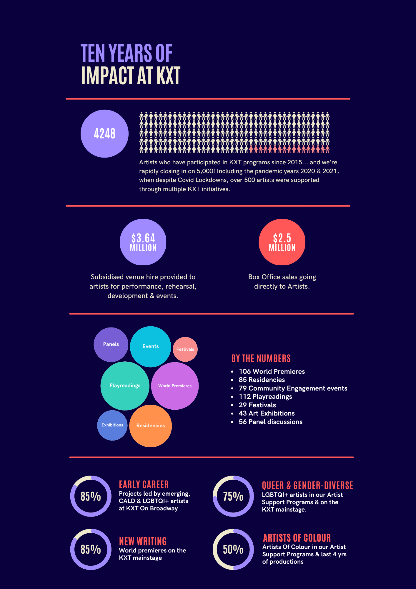 In 2025 The Laboratory delivered 7 stunning plays, under the astute and careful guidance of the phenomenal Saro Lusty-Cavallari who has nurtured countless new plays into life through the program. Last year Joanna Erskine delivered 2 weeks of the Storytellers Festival, featuring reads of 15 new plays. The Laboratory and Storytellers have been the birthplace of work that has gone onto feature on the Griffin Stages, Belvoir and indeed STC, as well as theatres in Melbourne, Brisbane Perth and Tasmania, and have won awards including the Patrick White Playwrights Award, the Rodney Seaborne Playwriting awards, and Green Rooms in Melbourne & STAs in Sydney. Saro and Jo are 2 wonderful associate artists at KXT who do the work that allows us to offer you so much. We’d also like to thank Kenneth and Jordy from partner company kwento; our StoryLines ambassadors Elijah and Renee; Aaron, Ziggy, Luke, Ellis, Aiden, Alex, Aliyah, Lily, Hamish, Charlie, and Claudia who are the KXT Venue Staff doing so much more than running the bar!, Chris Starnawski, for his ongoing behind the scenes support, Charlie Vaux who has worked tirelessly in Artist Support and is now stretching his wings into fundraising and partnerships, and Emily Buxton who has done so much. Over 4 years beginning with a little bit of FOH support, Emily built a role that supported so many: artists, staff, audience, and the KXT team. In 2026 Emily will be producing a wedding which means she’s moved on from KXT. It has taken a number of people to replace her: Liminka Pather is working in admin support for productions, Aaron Cornelius has taken over Venue Staffing, Claudia Elbourne is managing FOH through preview seasons and opening nights, and Charlie Vaux has expanded his role to include F2F production support. We have 1 other role we’re filling so standby for further announcements. Yes, it’s taken 5 people to replace Emily.